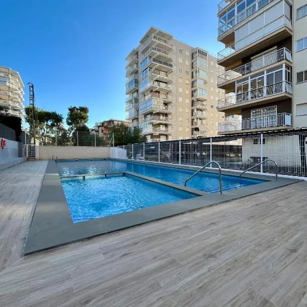 Apartamento en Voramar a 2 minutos de la playa享有海景,提供季节性室外泳池和阳台,距离沃拉马尔海滩(Voramar Beach)约有3分钟步行路程。这家自助式公寓拥有私人泳池、花园和免费私人停车位。 这家公寓配有2间卧室、2间浴室、床上用品、毛巾、平板电视、用餐区、设施齐全的厨房以及市景露台。