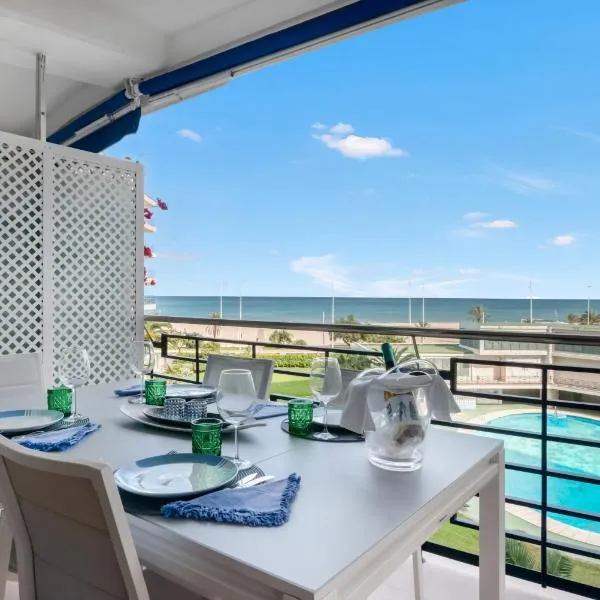 .Apartamento 1a linea de playa + piscina + parking DAIMUS享有市景,提供户外游泳池、花园和露台,距离戴姆斯海滩(Daimús Beach)约有2分钟步行路程。这家住宿提供私人泳池和免费私人停车位。 这家空调公寓配有3间卧室、起居室、带洗碗机和咖啡机的设施齐全的厨房以及2间带坐浴盆和淋浴设施的浴室。