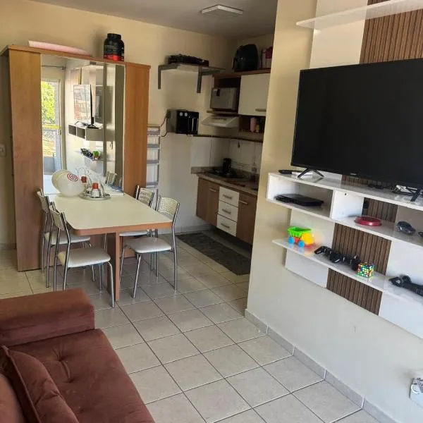 Flat Pertinho do Hot Park (200m)! Aconchegante!位于热河市,距离迪卡罗马公园有26公里,距离温泉公园有600米,提供免费WiFi以及带室外泳池的花园,享有池景。客人可以使用健身房和桑拿浴室。 每间房间都配有私人浴室和浴缸或淋浴设施、空调、平板电视以及冰箱。如未自带,客人可使用额外收费的毛巾和床上用品。 这家公寓式酒店的餐厅专供巴西风味美食。
