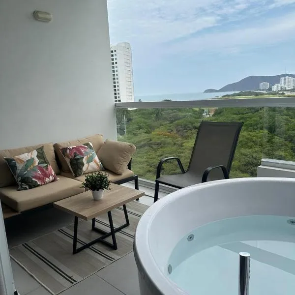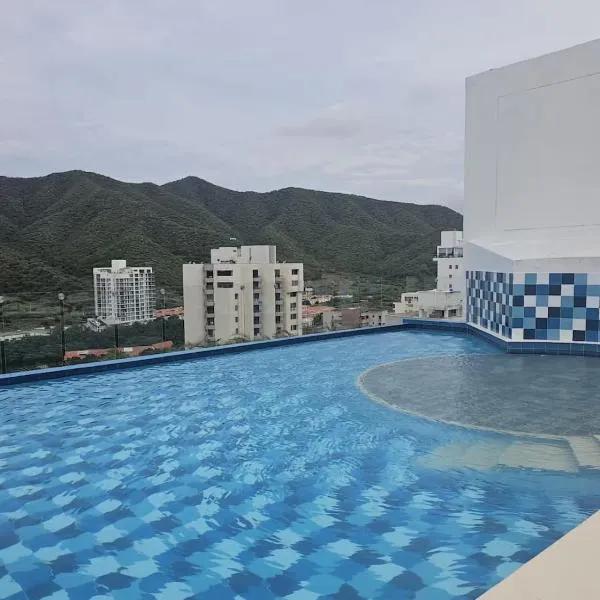 Apartamento inteligente para vacacionar y vivir位于圣玛尔塔,享有山景,配备户外游泳池、私家海滩、露台、餐厅和酒吧。住宿配备免费WiFi,内部提供私人停车位。 每间房间都享有市景或海景,配有厨房、有线频道平板电视、游戏机、书桌、洗衣机以及带淋浴设施和免费洗浴用品的私人浴室。住宿还提供冰箱、微波炉、炉灶、咖啡机和电热水壶。