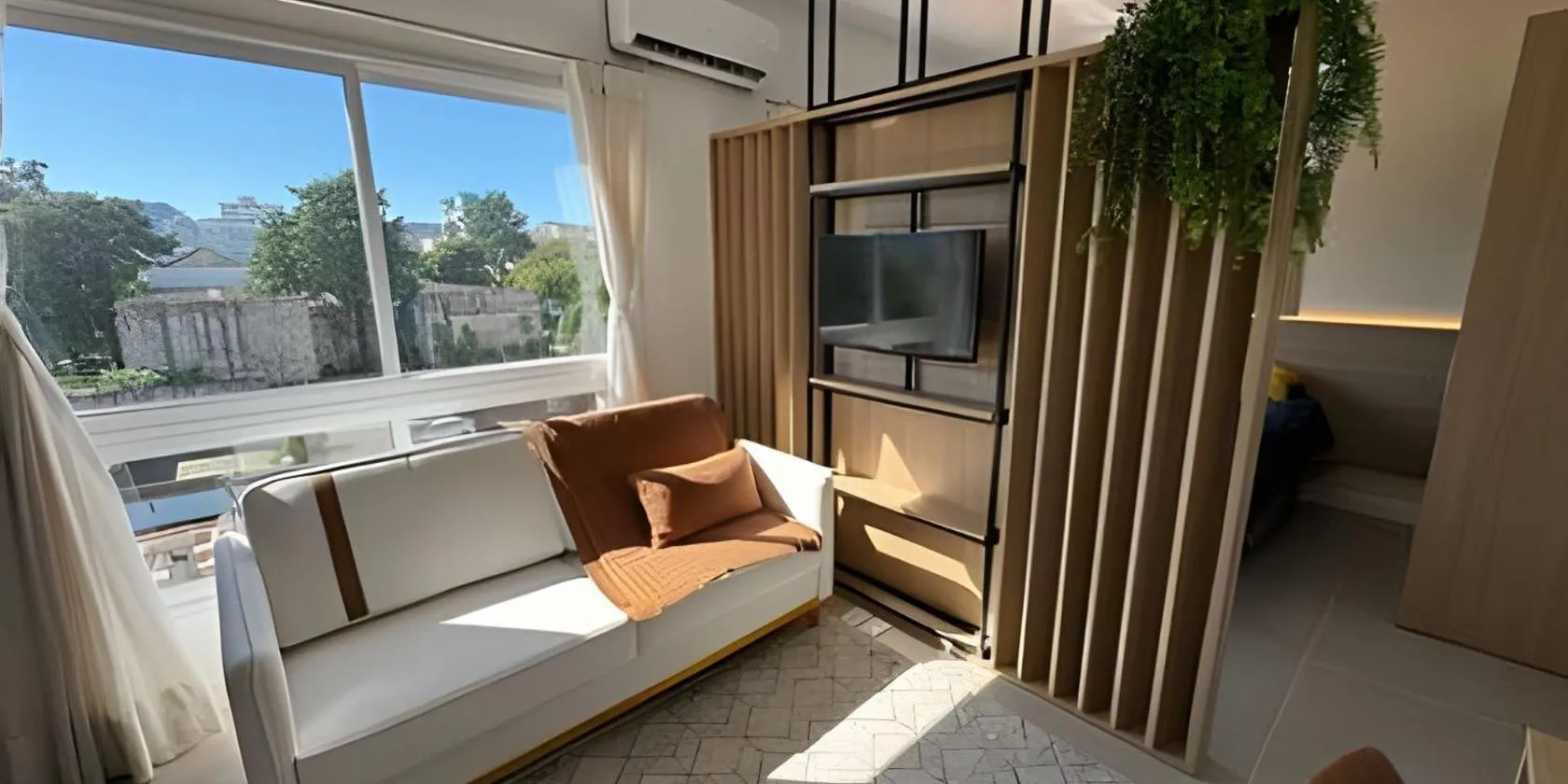 studio Aconchegante two坐落于圣玛丽亚,配备带阳台和免费WiFi的自助式住宿。 这家公寓拥有1间卧室、带平板电视的起居室、设施齐全的小厨房以及1间带淋浴设施的浴室。这家公寓也配备1间浴室。 圣马丽亚机场距离住宿有12公里。