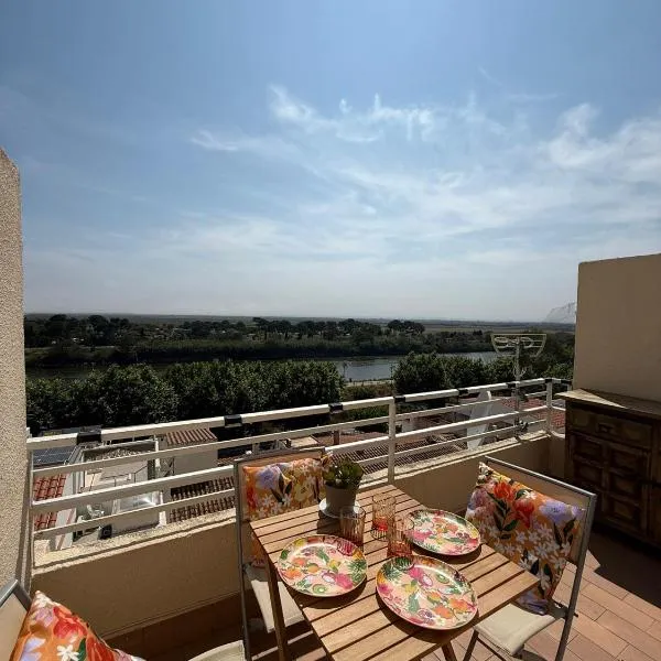 Boasting air-conditioned accommodation with a pool with a view, Vue Panoramique sur la Mediterrannée, appartement sur canal & proche plage is situated in Roses.
