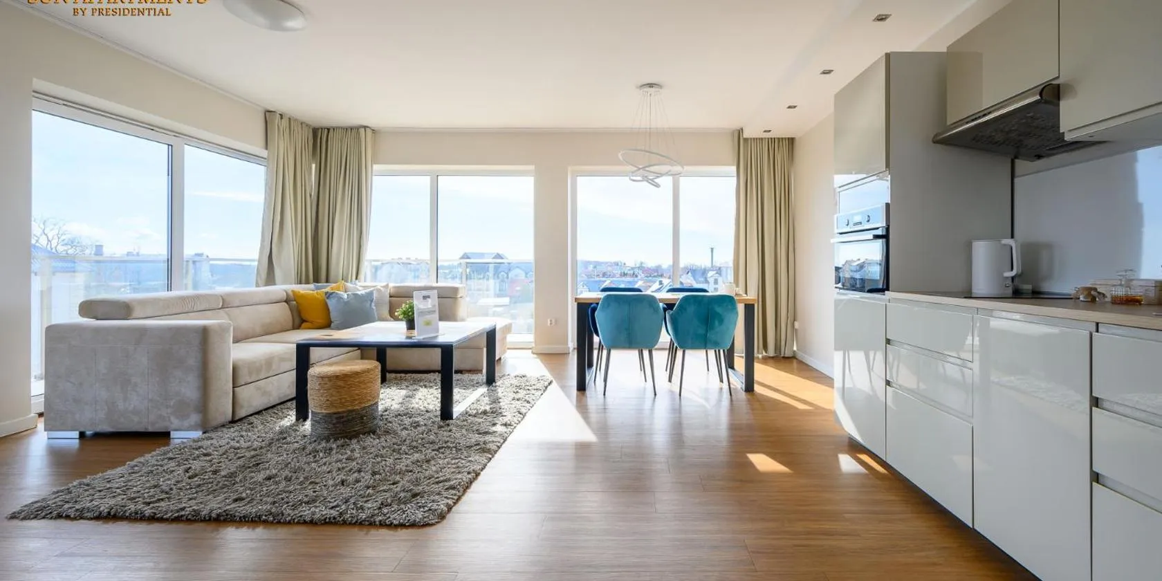 Prezydencki Apartamenty z widokiem na morze提供季节性室外泳池、露台以及带阳台和免费WiFi的空调住宿,距离亚罗斯瓦维奇海滩(Jarosławiec Beach)有3分钟步行路程。内部提供私人停车位。 房间均提供带沙发床的休息区、卫星频道平板电视、蓝光播放机、设施齐全的厨房以及带免费洗浴用品和吹风机的私人浴室。