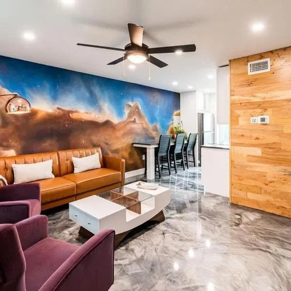The Shark Tank Cocoa Beach - Retro Florida, Downtown, 5-Min Walk to Beach, Shops & Bars位于佛罗里达州的可可比奇,配有阳台。这家住宿距离可可海滩(Cocoa Beach)有3分钟步行路程,提供花园和免费私人停车位。