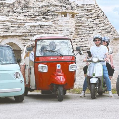 Let yourself be transported by our driver with the classic Ape Calessino, (or ebike, e-vespa, fiat mouse) to admire, photograph and discover the Trulli of Alberobello in a convenient and informative way! An onboard audio tour system will provide all the secrets and legends related to this unique and picturesque town. And 'possible, if the number of participants is greater than 2, in addition to the Calessino Bee (led by one of our drivers), the use of the electric Vespa and fiat mouse. (these follow the path of the Bee and are equipped with audio tour system on board) The perfect solution to the heat and steep climbs of Alberobello