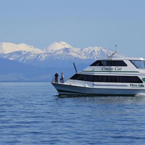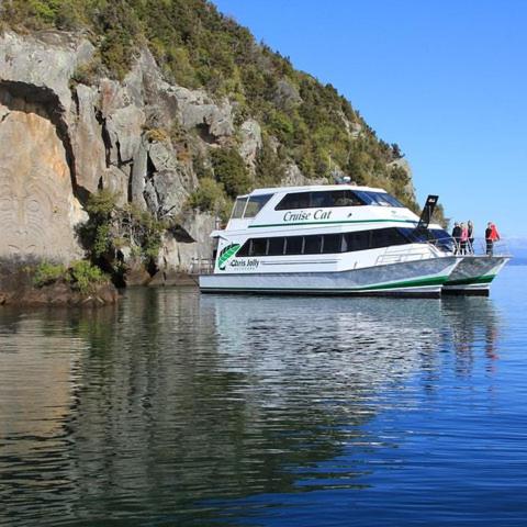 Our Daily Scenic Cruises depart from Berth #4 at the Taupo Boat Harbour on Cruise Cat. You’ll love cruising in comfort and style with fabulous views from both the top and bottom decks. Cruise Cat is fully enclosed with large outdoor decks to enjoy close up views of the Maori Rock Carvings. Children are welcome, and we have colouring-in sheets and wheel certificates available for them. Cruise Cat is also wheelchair and push chair/stroller accessible.