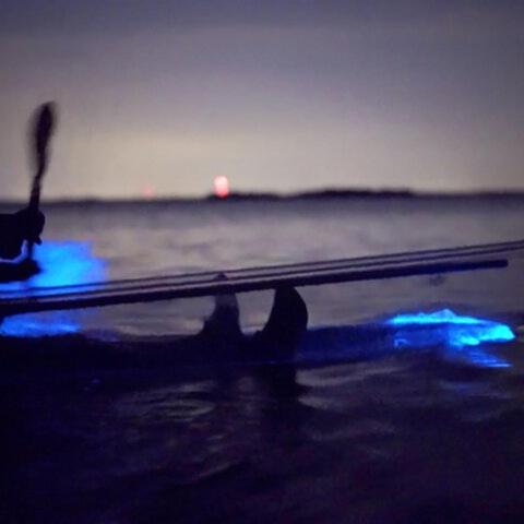 After sunset, we'll paddle into the night as dinoflagellates bioluminescence illuminates the water and fish below us.