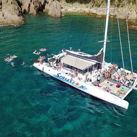 在这次沿着布拉瓦海岸(Costa Brava)海岸线的四小时双体船之旅中,你将沿着海滩、悬崖、洞穴和海湾航行至风景秀丽的游泳点。你还可享用自助烧烤以及免费酒吧的啤酒和桑格利亚酒。在旅行期间,你将在岩石附近的隐蔽海湾停留两个小时,那里的活动包括潜水、蹦床活动和日光浴。
