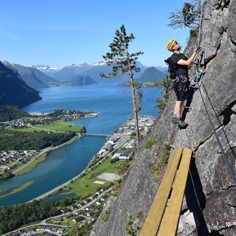 The view as you go are simply stunning, the photo opportunities incredible and the rush of adrenaline you get from facing your fears and go through them anyway, is nothing short of fantastic! Reasonable fitness and ability required. The climb takes on average 5-6 hrs return, where you will be guided by professional and secured to the mountain by cable throughout. Upon reaching the peak of the Nesaksla mountain, you hike via the scenic photoplatform Rampestreken, before returning to the Norwegian mountaineering centre.