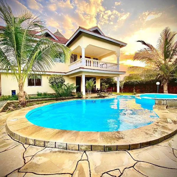 Diani-Paradise-Villas位于迪亚尼海滩,享有花园景,配备户外游泳池、花园、私家海滩、共用休息室和露台。住宿配备免费WiFi,内部提供私人停车位。 每间房间都配有阳台、带冰箱的设施齐全的厨房、带沙发床休息区、平板电视以及带淋浴设施和吹风机的私人浴室。住宿还提供微波炉、炉灶、吐司机和电热水壶。 这家别墅提供单点和美式早餐两种选择。