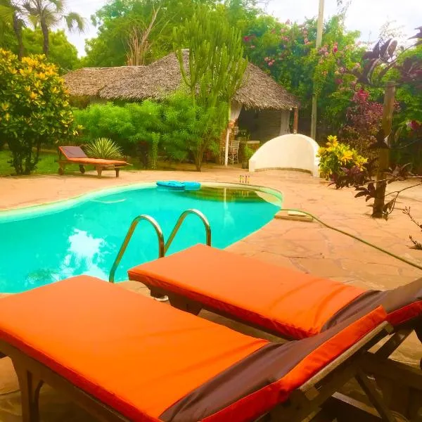 Galu Ecolodge - Diani Beach提供餐厅、户外游泳池、花园和私家海滩,距离加卢海滩(Galu Beach)有5分钟步行路程。住宿提供免费WiFi,内部提供私人停车位。 早餐提供欧陆式、全套英式/爱尔兰式或美式三种选择。 这家住宿加早餐旅馆提供儿童游乐区。 Galu Ecolodge - Diani Beach配备露台和共用休息室。