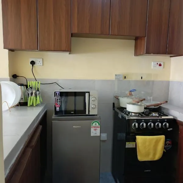2 bedroom Stylish Apartment, Kisumu提供带阳台的住宿,距离奇苏穆博物馆有4公里。住宿提供免费WiFi,内部提供私人停车位。 房间配有空调、设施齐全的厨房、平板电视以及带浴缸、免费洗浴用品和拖鞋的私人浴室。住宿还配备冰箱、炉灶和电热水壶。 这家住宿加早餐旅馆距离恩代雷岛国家公园有42公里,距离Maseno University有26公里。基苏木机场距离住宿有5公里。