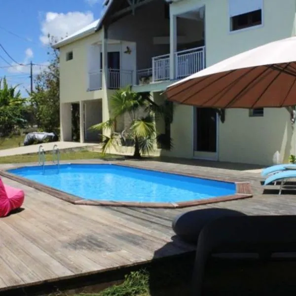Villa位于Baie Mahault,提供户外游泳池、共用休息室和露台。这家自助式度假屋配有私人泳池、花园、烧烤设施、免费WiFi和免费私人停车位。 这家空调度假屋配有3间卧室、起居室、带冰箱和咖啡机的设施齐全的厨房以及2间带淋浴设施和热水浴池的浴室。这家度假屋还提供休息区、洗衣机以及2间带免费洗浴用品的浴室。 这家度假屋提供热水浴池。 彭德-雅皮特国际机场距离住宿有8公里。