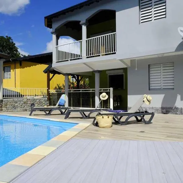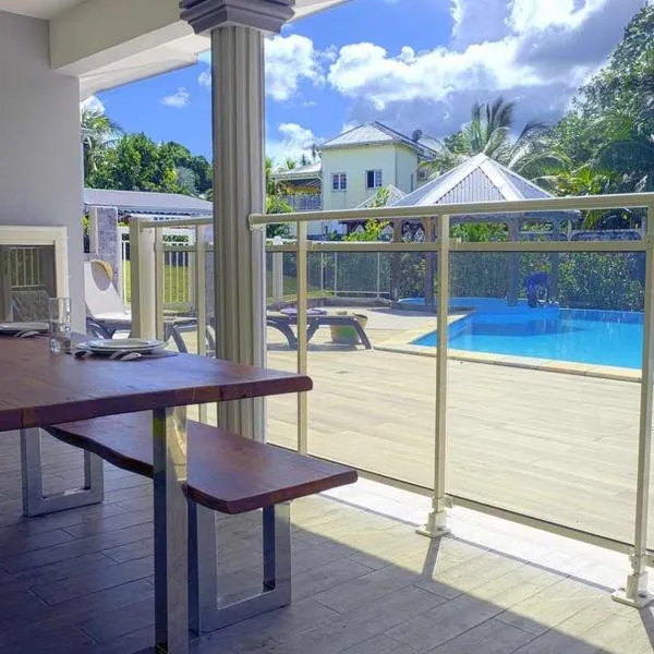 Villa位于Baie Mahault,提供户外游泳池、共用休息室和露台。这家自助式度假屋配有私人泳池、花园、烧烤设施、免费WiFi和免费私人停车位。 这家空调度假屋配有3间卧室、起居室、带冰箱和咖啡机的设施齐全的厨房以及2间带淋浴设施和热水浴池的浴室。这家度假屋还提供休息区、洗衣机以及2间带免费洗浴用品的浴室。 这家度假屋提供热水浴池。 彭德-雅皮特国际机场距离住宿有8公里。