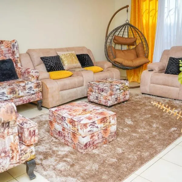 Mileslin Homes位于Machakos的马查科斯,配有阳台。这家住宿距离卡通加森林有12公里,提供露台和免费私人停车位。 这家空调公寓配有1间卧室、起居室、带微波炉和电热水壶的设施齐全的厨房以及1间带淋浴设施和免费洗浴用品的浴室。这家公寓还配备平板电视以及1间带拖鞋的浴室。 这家公寓距离内罗毕SGR总站有46公里,距离Machakos Peoples...