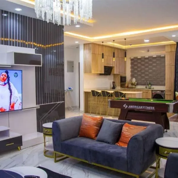 Luxury Shortlet Apartment Ajah, Lekki Lagos坐落于拉各斯,距离勒奇保育中心有12公里,距离耐克美术馆有22公里,配备免费WiFi以及带室外泳池的花园,享有市景。客人可以使用健身房和热水浴池。内部提供私人停车位。 每间房间都提供露台、带冰箱的设施齐全的厨房、带沙发床休息区、平板电视、洗衣机以及带淋浴设施和免费洗浴用品的私人浴室。