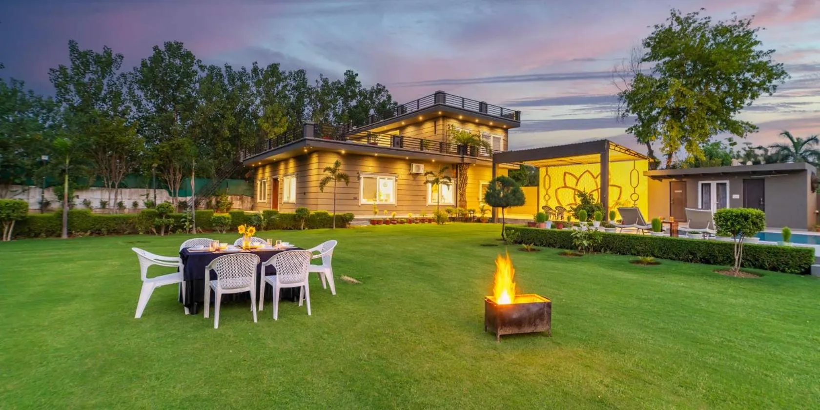 StayVista at Palash Van Luxury 3BR Private Pool Villa in New Delhi with Bonfire, Wi-Fi位于法里达巴德,提供带免费WiFi的花园景客房,配有户外游泳池。这家自助式别墅拥有私人泳池、花园和免费私人停车位。 这家空调别墅配有3间独立卧室、起居室、带冰箱和微波炉的设施齐全的厨房以及5间浴室。