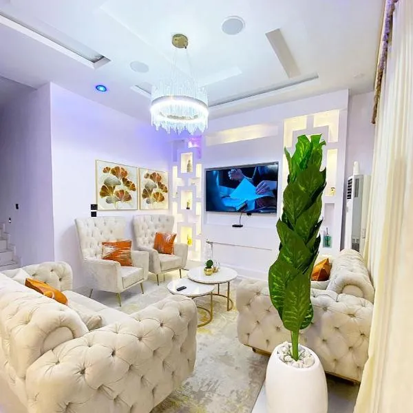 Lekki holiday shortlet享有花园景,配备季节性室外泳池和阳台,距离勒奇保育中心约有9公里。这家自助式度假屋配有私人泳池、花园和免费私人停车位。 这家度假屋配备4间卧室、4间浴室、床上用品、毛巾、带卫星频道的平板电视、用餐区、设施齐全的厨房以及池景露台。这家空调度假屋还提供休息区、洗衣机以及4间带淋浴设施和浴缸的浴室。 这家度假屋提供汽车租赁服务。