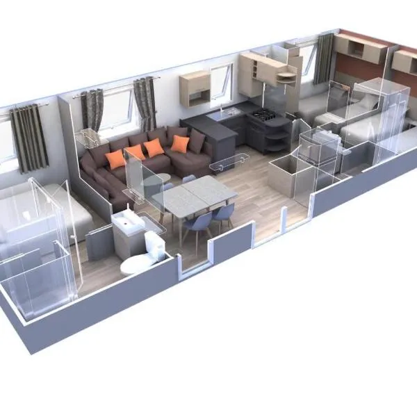 Mobil home prestations DELUXE 3ch climatisé avec Parc Aquatique提供免费自行车、季节性室外泳池以及带阳台和免费WiFi的空调住宿,距离萨迪纳尔海滩(Sardinal Beach)有12分钟步行路程。内部提供私人停车位。 每间房间都提供露台、带冰箱的设施齐全的厨房、带沙发床休息区、平板电视以及带淋浴设施和免费洗浴用品的私人浴室。