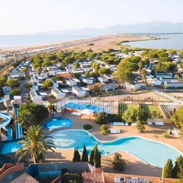 Le Lagon Rose nice bungalow Camping SIBLU le Mar Estang Canet-en-Roussillon, 2 rooms, 2 bathrooms, 2 TV, free WIFI, sheets & towels included, beach at 5 mn walk提供户外游泳池、花园以及带阳台和免费WiFi的空调住宿,距离马伊思堂海滩(Mar...