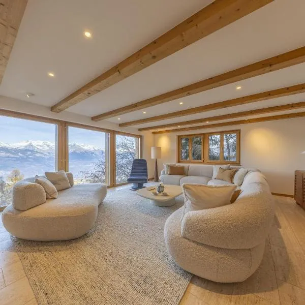 Chalet Le Papillon - Calm, sunny, spacious坐落于南达,距离锡永高尔夫球场有15公里,距离克莱恩斯希瑞高尔夫球场有32公里,拥有免费WiFi和花园。客人可以使用桑拿浴室。 每间房间都配有露台、带冰箱的设施齐全的厨房、壁炉、带沙发休息区、电视、洗衣机以及带淋浴设施的私人浴室。住宿还配备洗碗机、烤箱、微波炉和咖啡机。 这家小木屋距离Mont...