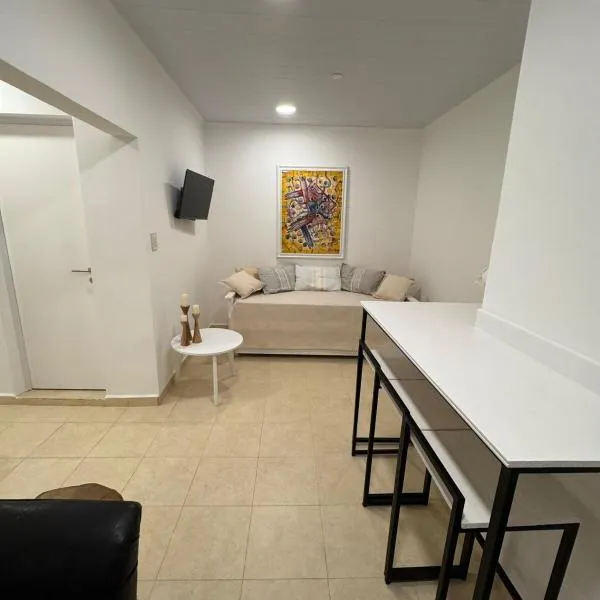 HOME UNO ESPE a 2 cuadras de peatonal位于雷西斯膝西亚,配备带阳台和免费WiFi的自助式住宿。 这家空调公寓配有1间卧室、起居室、带冰箱和电热水壶的设施齐全的厨房以及1间带淋浴设施和免费洗浴用品的浴室。这家公寓还提供平板电视以及1间带吹风机的浴室。 雷西斯藤西亚国际机场距离住宿有7公里。