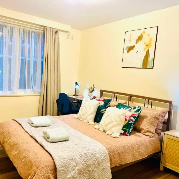 Free Parking 5min Walk to Asian Supermarket Family Room Deakin Uni Quiet Camberwell坐落于坎伯维尔,享有花园景,拥有免费WiFi和免费私人停车位,距离查德斯通购物中心有5.5公里。住宿配有热水浴池。 所有房间均配有市景露台、带冰箱和烤箱的厨房以及带淋浴设施的共用浴室。部分客房拥有阳台和/或庭院。