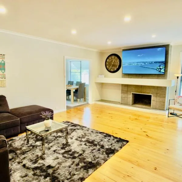 The Sinatra Holiday House in Mulwala - 10 individual beds位于穆尔瓦拉,配有空调客房和私人泳池。这家度假屋享有湖景,配备游泳池和花园,也为客人提供免费WiFi。 这家度假屋配有5间卧室、带有线频道的电视、带冰箱和洗碗机的设施齐全的厨房、洗衣机以及2间带浴缸的浴室。2间浴室提供吹风机。 这家度假屋距离托克姆沃尔高尔夫俱乐部有48公里。