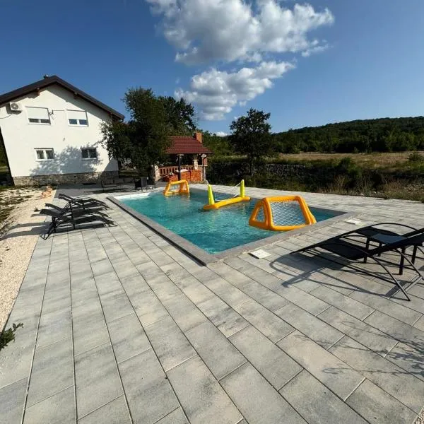 Kuća s osmijehom位于利夫诺,提供带免费WiFi的池景客房,配有季节性室外泳池。这家自助式度假屋配有私人泳池、花园和免费私人停车位。 这家度假屋提供露台,享有山景,拥有3间卧室、起居室、平板电视、带冰箱和烤箱的设施齐全的厨房以及2间带淋浴设施的浴室。这家度假屋还配备休息区、洗衣机以及2间带免费洗浴用品的浴室。