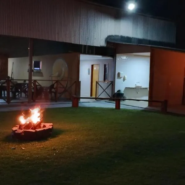 Rancho Nosso Lago坐落于多明戈斯马丁斯,配有全年开放的室外泳池,享有湖景。这家自助式小木屋拥有花园和免费私人停车位。 这家2卧室小木屋提供起居室、带卫星频道的平板电视、带冰箱和烤箱的设施齐全的厨房以及2间浴室。这家小木屋也配有2间浴室。 维多利亚机场距离住宿有72公里。