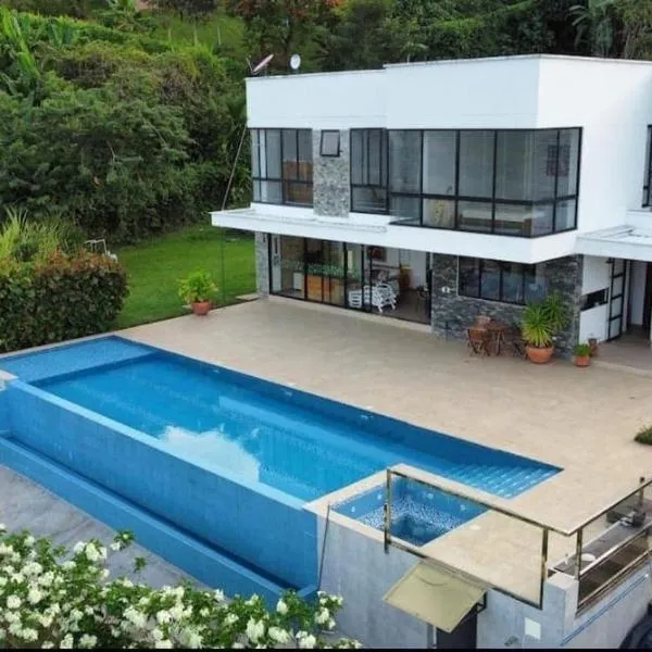 El descanso perfecto享有花园景,配备庭院和电热水壶,距离Viaduct between Pereira and Dosquebradas约有29公里。这家住宿的客人可以使用阳台、免费私人停车位和免费WiFi。 这家度假屋提供露台,享有山景,配有3间卧室、起居室、平板电视、带冰箱和微波炉的设施齐全的厨房以及3间带淋浴设施的浴室。