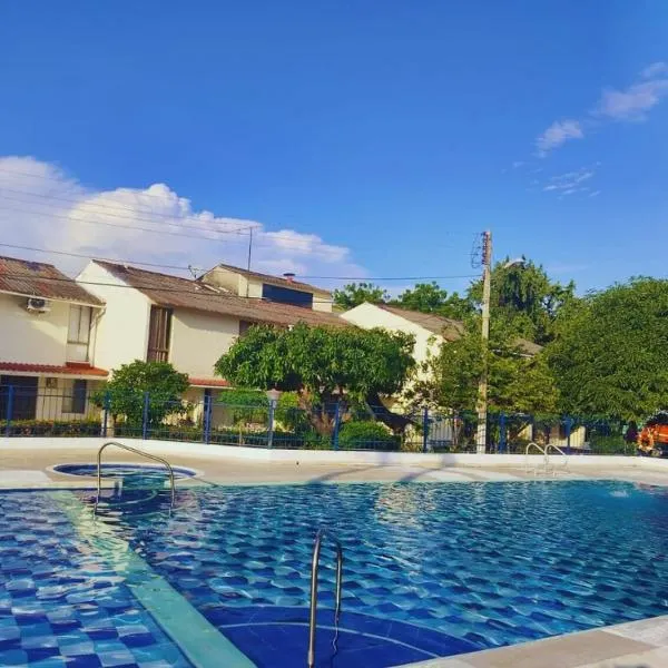 Hermosa y cómoda casa en conjunto con piscina en Girardot位于吉拉尔多特,配备带免费WiFi的花园景客房,配有户外游泳池和露台。这家自助式度假屋配有私人泳池、花园和免费私人停车位。 这家度假屋拥有2间卧室、带有线频道的平板电视、带冰箱和烤箱的设施齐全的厨房、洗衣机以及2间带淋浴设施的浴室。这家度假屋也配有2间浴室。