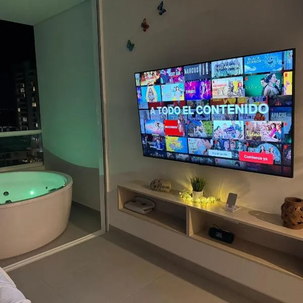 Suite D’lujo: Jacuzzi privado BH, a property with a private beach area, pool with a view and a garden, is situated in Santa Marta, 200 metres from Bello Horizonte, 11 km from Rodadero Sea Aquarium and...