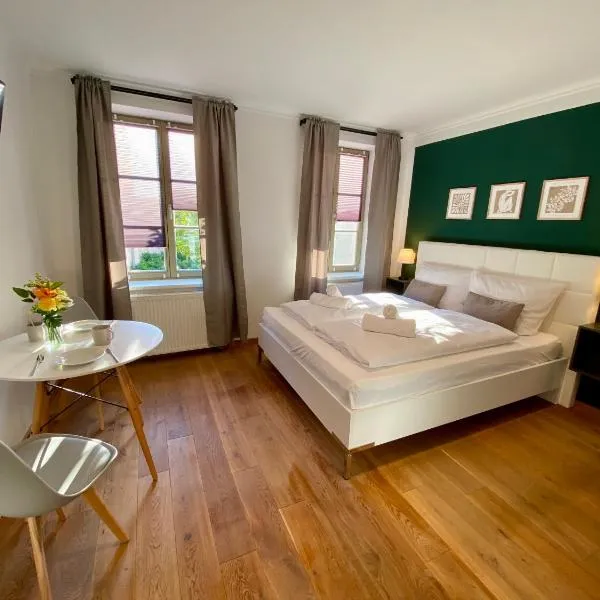 Blaue Gans享有河景,配备庭院和咖啡机,距离科林修道院约有18公里。这家住宿距离尚森昂帕庞格朗德滑道有14公里,提供花园和免费私人停车位。 这家公寓提供露台,享有市景,配有1间卧室、起居室、平板电视、带冰箱和洗碗机的设施齐全的厨房以及1间带淋浴设施的浴室。1间浴室配有浴缸,也提供吹风机,提供毛巾和床上用品。 这家公寓距离贝尔瑙剧院有44公里。
