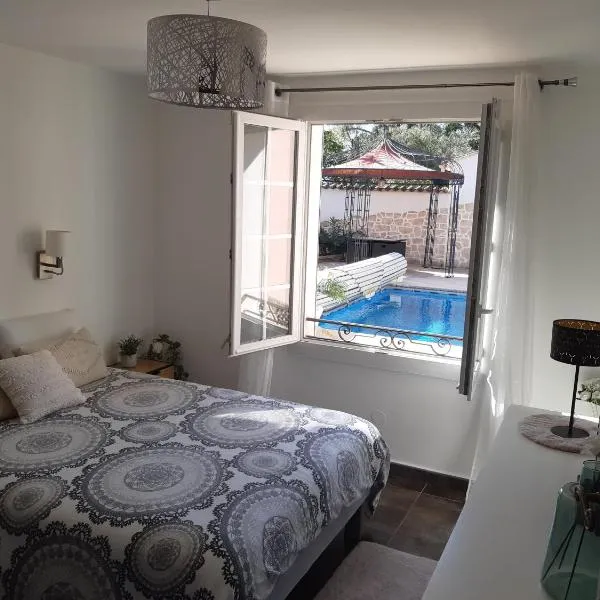 Le Nid des Maures位于勒卡内代莫尔,距离Le Pont des Fées有28公里。客人可以使用热水浴池。这家自助式公寓配有私人泳池、花园和免费私人停车位。 这家公寓配有2间卧室、1间浴室、床上用品、毛巾、带有线频道的平板电视、设施齐全的厨房以及池景露台。这家空调公寓还提供休息区以及1间带淋浴设施和热水浴池的浴室。 住宿内部配备室外泳池。客人可以在这家公寓附近体验徒步。