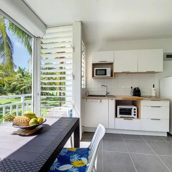 Studios FREEBROISE位于圣弗朗索瓦,享有海景,配备户外游泳池、花园、私家海滩、露台和酒吧。住宿配备免费WiFi,内部提供私人停车位。 房间均配有空调、带用餐区的设施齐全的小厨房、平板电视以及带淋浴设施和吹风机的私人浴室。住宿还提供冰箱、微波炉、炉灶和咖啡机。
