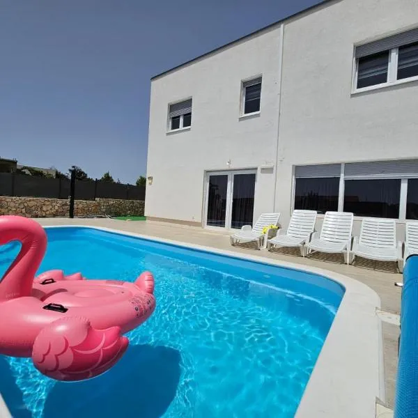 Villa Dagovi in Vrsine - Haus für 9 Personen坐落于Vrsine,配有室外泳池,享有山景。这家自助式别墅拥有私人泳池、花园和免费私人停车位。 这家空调别墅配有5间卧室、起居室、带冰箱和电热水壶的设施齐全的厨房以及2间带淋浴设施和吹风机的浴室。这家别墅也拥有2间浴室。