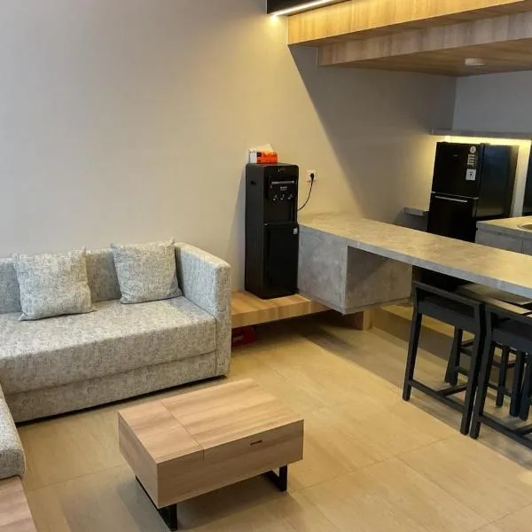 2BR Serviced Apartment at Vanya Park Asatti Garden BSD City位于当格浪,提供免费WiFi、空调、户外游泳池和花园,距离印尼会展中心有5.1公里,距离庞多克印达购物中心有26公里。内部提供私人停车位。 这家公寓享有池景,提供露台,配有2间卧室、起居室、卫星频道平板电视、设施齐全的厨房以及1间带坐浴盆和淋浴设施的浴室。