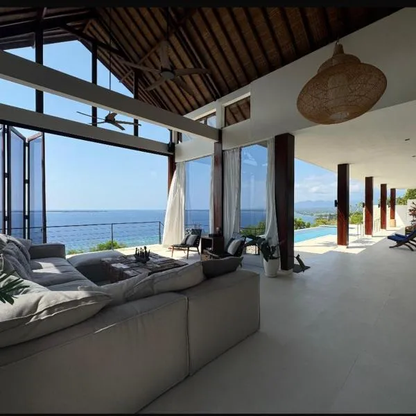 Villa The JIWA! Sea view with private pool in Lombok享有山景,配备庭院和咖啡机,距离滕博宝海滩(Tembobor Beach)约有6分钟步行路程。这家住宿提供私人泳池、免费WiFi和免费私人停车位。 这家别墅配备3间卧室、5间浴室、床上用品、毛巾、平板电视、用餐区、设施齐全的厨房以及海景露台。
