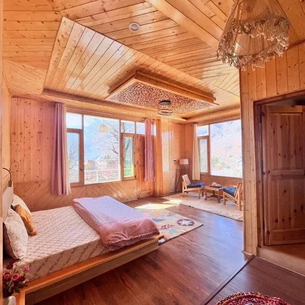 Serene Homes - Cottage in Haripur, Manali位于喜马偕尔邦的Haripūr,配有阳台,享有山景。内部提供私人停车位。 这家家庭式住宿配有平板电视。这家家庭式住宿提供毛巾和床上用品。 这家家庭式住宿供应自助早餐。