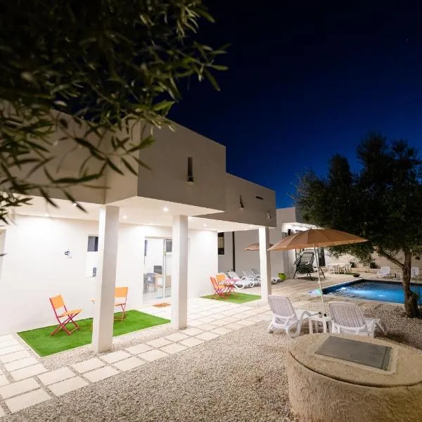 White houses luxury and pool享有池景,提供免费自行车、户外游泳池和露台,距离巴塔利亚海滩(Battaglia Beach)约有2分钟步行路程。这家自助式公寓配有私人泳池、花园、烧烤设施、免费WiFi和免费私人停车位。 这家空调公寓配有1间卧室、起居室、带冰箱和咖啡机的设施齐全的厨房以及1间带坐浴盆和淋浴设施的浴室。