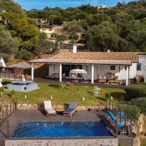 Villa di Cala Regina, Maison de charme位于夸尔图-圣埃莱娜,提供带免费WiFi的海景客房,配备户外游泳池、花园和私家海滩。这家住宿距离特拉玛拉(Terra Mala)有3分钟步行路程,配备共用休息室和免费私人停车位。 这家空调别墅配有4间卧室、起居室、带冰箱和咖啡机的设施齐全的厨房以及4间带坐浴盆和淋浴设施的浴室。