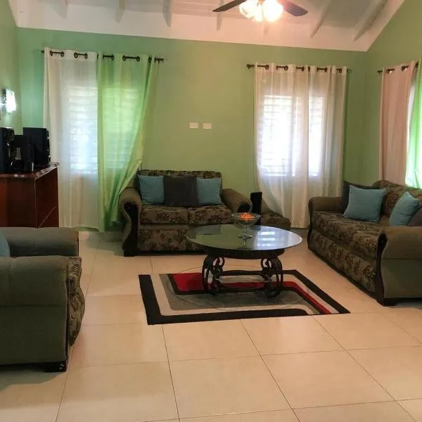 Jus4U-1 The Home Away From Home Villa坐落于欧丘里欧。这家住宿距离马米湾海滩(Mammee Bay Beach)有2.7公里,配备花园和免费私人停车位。 这家度假屋提供庭院,享有花园景,拥有2间卧室、起居室、平板电视、带冰箱和烤箱的设施齐全的厨房以及1间带淋浴设施的浴室。这家度假屋也配备休息区和1间浴室。 这家度假屋提供汽车租赁服务。