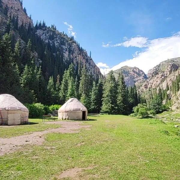 Zalkar Yurt Camp提供位于Song-Kul的住宿。内部提供私人停车位。 这家旅馆的部分客房配有共用浴室,还享有山景。 Zalkar Yurt Camp的客人可以享用单点早餐。