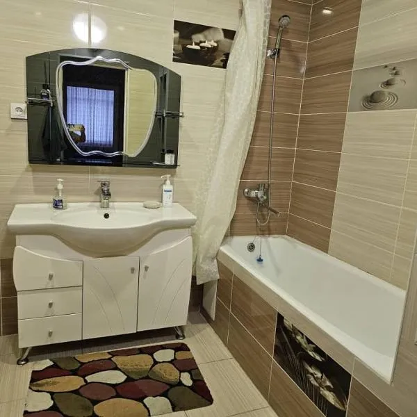Apartment elit Bishkek位于比什凯克,提供带阳台和免费WiFi的自助式住宿。 这家空调公寓配有1间卧室、起居室、带冰箱和电热水壶的设施齐全的厨房以及1间带淋浴设施和免费洗浴用品的浴室。1间浴室配有浴缸,也提供吹风机,提供毛巾和床上用品。 玛纳斯国际机场距离住宿有33公里。
