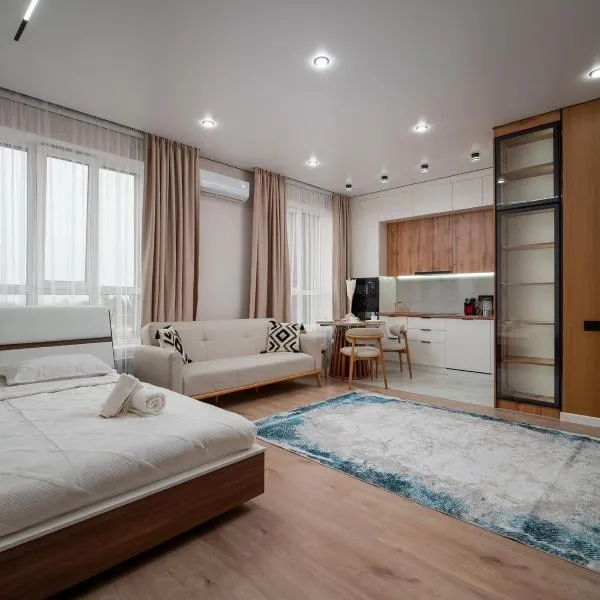 Arbat Central Apartment位于阿拉木图,提供免费WiFi和平板电视等设施,距离Ascension Cathedral有7分钟步行路程,距离Gvardeytsev-Panfilovtsev Park有700米。这家公寓距离阿拉木图2号火车站有2公里,距离共和国宫有2.9公里。 这家空调公寓配有1间卧室、起居室、带冰箱和电热水壶的设施齐全的厨房以及1间带浴缸和免费洗浴用品的浴室。
