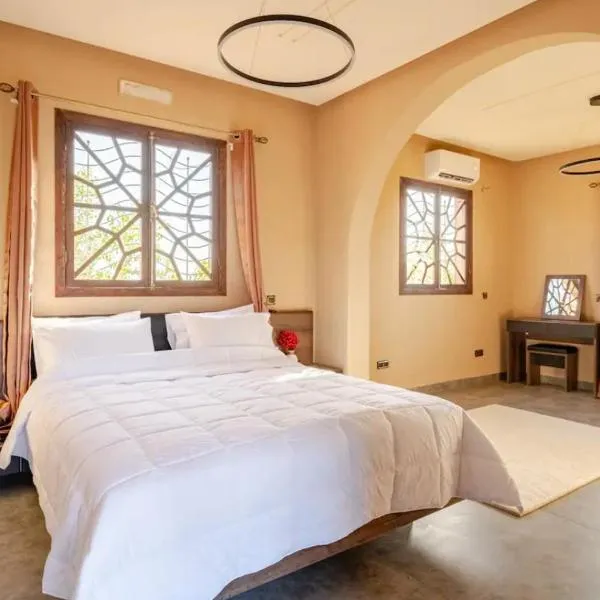 Villa Agora, Villa à la campagne proche Marrakech坐落于马拉喀什,距离巴伊亚宫有20公里,配备户外游泳池、免费私人停车位、花园和共用休息室。这家住宿拥有露台、按摩服务和烧烤设施。住宿提供机场交通服务和自行车租赁服务。 这家旅馆的所有客房都提供衣柜、床上用品和花园景庭院。