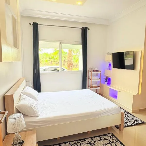 Beralmar坐落于艾西拉,提供私人泳池和阳台,享有花园景。这家住宿距离艾西拉海滩(Plage de Asilah)有不到一公里,配备露台和免费私人停车位。 这家空调公寓配有1间独立卧室、起居室、设施齐全的小厨房以及1间浴室。这家公寓也配备1间浴室。 这家公寓距离丹吉尔大球场有35公里,距离丹吉尔美国公使馆有41公里。丹吉尔伊本白图泰机场距离住宿有30公里。