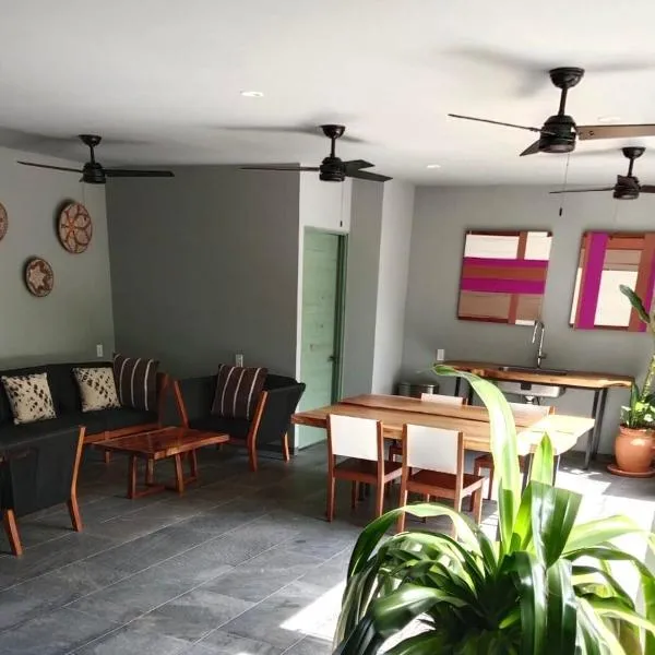 Departamento céntrico Huatulco坐落于圣克鲁斯华特库,距离查韦海滩(Chahue Beach)有18分钟步行路程,距离瓦图尔科市中心/鲁塞西塔有1.2公里,距离瓦图尔科国家公园有6.7公里。这家住宿的客人可以使用庭院、免费私人停车位和免费WiFi。 这家空调公寓配有2间卧室、起居室、带烤箱和咖啡机的设施齐全的厨房以及1间带淋浴设施的浴室。