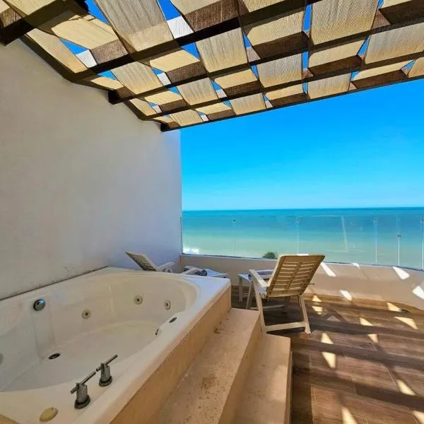 Condo vista al mar, alberca rooftop Chixchulub坐落于希克苏鲁伯,提供私人泳池。这家公寓距离二十一世纪会议中心有34公里,距离梅里达大教堂有42公里。 这家空调公寓配有3间独立卧室、带冰箱和微波炉的设施齐全的厨房以及3间浴室。这家公寓还配备电视以及3间带免费洗浴用品的浴室。